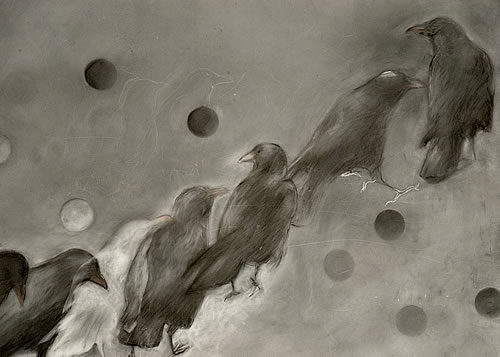 Joanna and I have been in a writing group together for about a year, and have often found our thematic concerns converging. Crows are known for their transforming power and for being tricksters -- whether in our world or within a line of poetry. Joanna has drawn the visual art called "Sentencing Crows" and I have written the poem "Make-Believe".