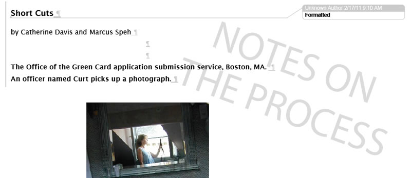 I really like your notion of the formatting mark-up, especially as it relates to construction and the concept of blueprint. Ingenious! It occurs to me upon viewing the draft, that a further separation between "the frame" and "the matter" might enhance (and clarify) the concept. That is, the formatting marks might be scaled to a faint gray - or even blue, as in blueprint! - in a less bulky font (for the markup) and perhaps even cheated adjusted a bit: such as removing the large left-hand vertical lines? In this way, the essence of the concept is subtilely rendered but still quite clear. (The lingering imprint, the shadow, the residue of formatting marks....) Such a separation creates another level for the reader, and I think would facilitate access to this collaborative piece. I'm including a quick example I made - here the mark up is simply the standard available in my Word program, and I'm sure you could improve upon.